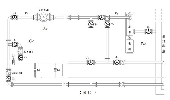 如圖2所示:在壓力鋼管進機組處的位置附近取水。K1、K2分別這取水閥和工作閥,Y為ZJY46H-40C DN150減壓閥。P2的壓力整定為0.6MPa,減壓后的水直供水池,再由水池供兩臺機組用水。調節閥門K3為合適的過流面積。改進前的單臺ZJY46H-40C DN150減壓閥的流量在滿足兩臺機組運行時,運行噪音為118dB。
