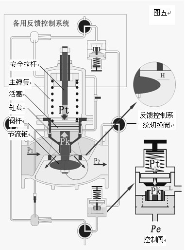 當(dāng)P1上升時,減壓閥的P2+ΔP2首先表現(xiàn)為上升,其值通過反饋系統(tǒng)出口管傳到控制閥,使Pt′+ΔPt′,ΔPt′與Pk′的力達(dá)到新的平衡,控制閥h減??;相應(yīng)ΔPk′壓力增大,經(jīng)壓力導(dǎo)管,使主閥的Pk+ΔPk,Pt=Pk+ΔPk壓力達(dá)到新的平衡,主閥h減小、ΔP2值恢復(fù)為原P2值。當(dāng)進(jìn)口壓力P1下降時,主閥與控制閥的工況則與上述的工況相反。